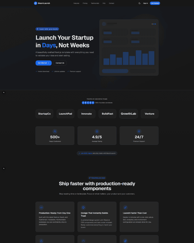 Launch fast with BloomLaunch: a free Next.js startup template. Built with Tailwind CSS 4 & Shadcn UI. SEO-ready, dark mode, and high-performance included.